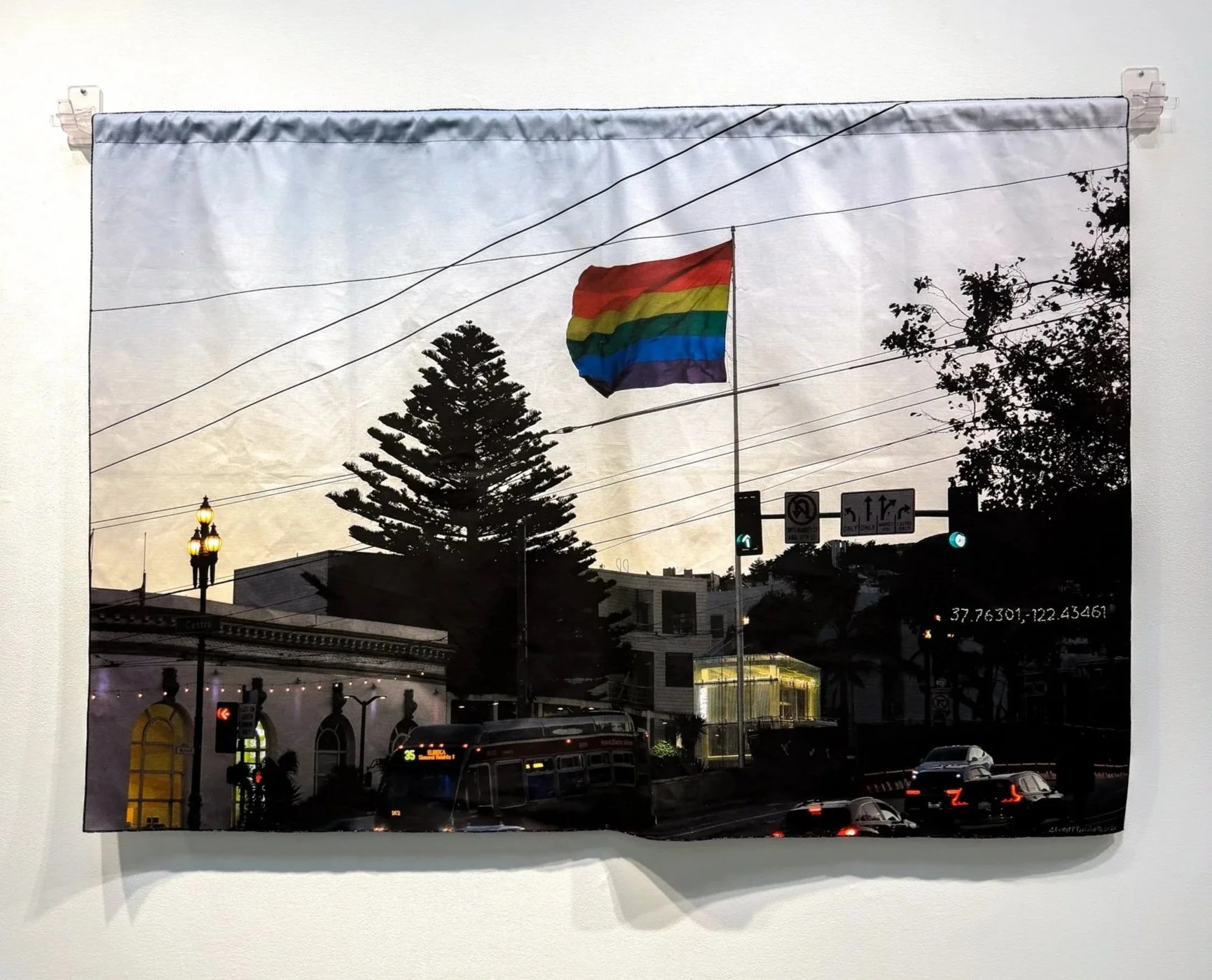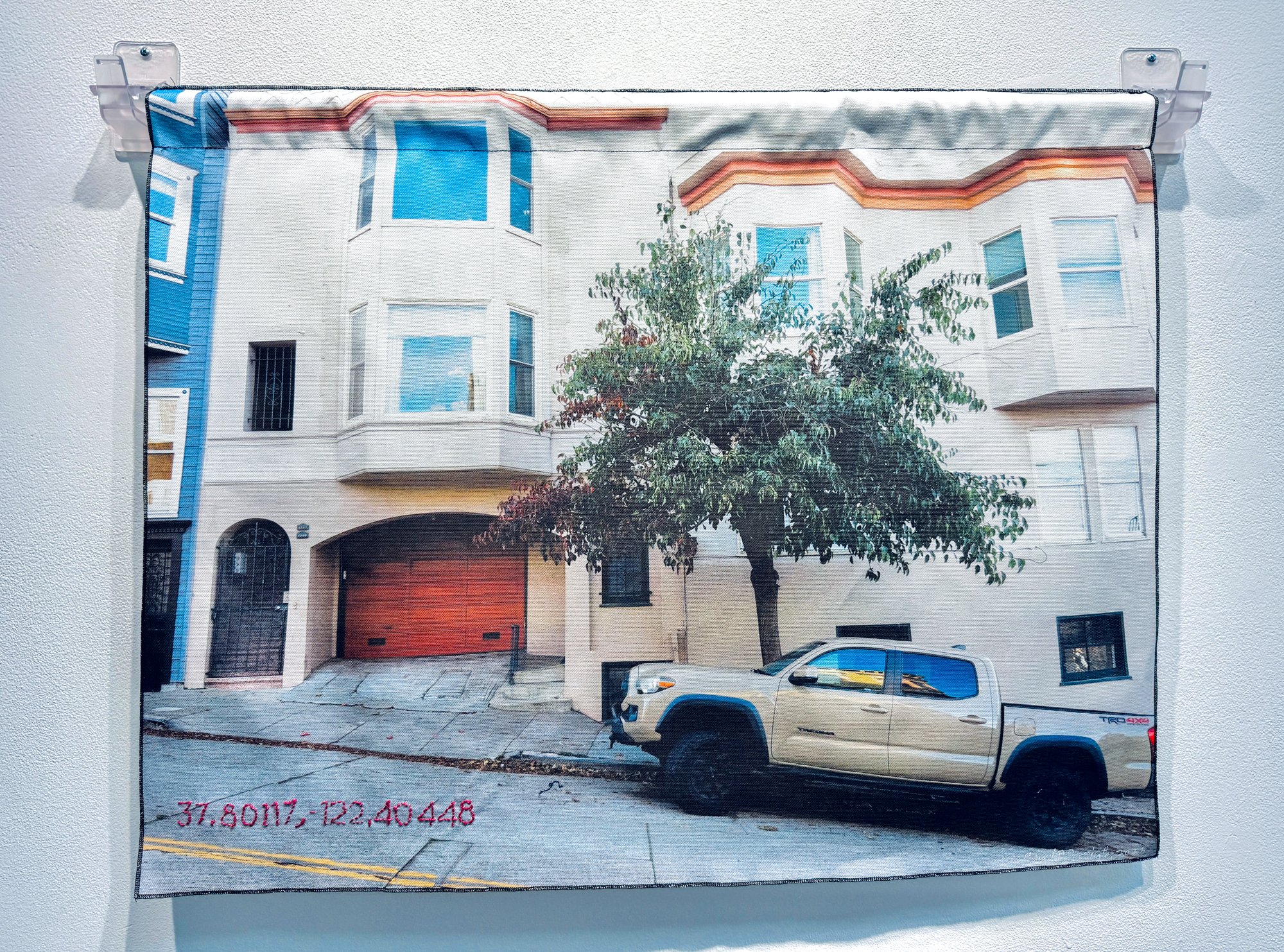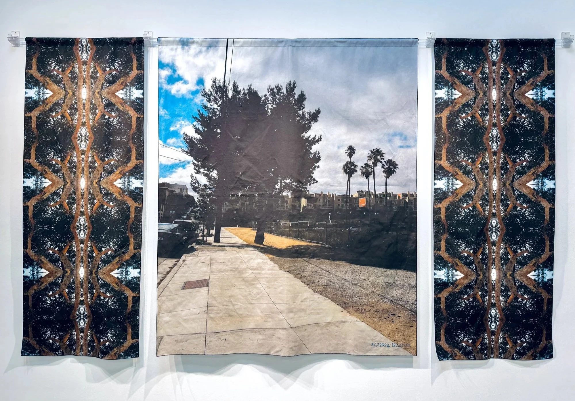 Through photographic textiles and glass works, the exhibition proposes a cartography that extends beyond zoning, administrative boundaries, and the optimized flows of capital and information. Selecting one tree from each of the city's thirty-six neighborhoods, Derricotte assembles a portrait of San Francisco as a living network of adaptation, persistence, and kinship. Indigenous California species appear alongside Australian imports, including the contested eucalyptus, whilst Southern magnolias, displaced from their southeastern origins, flourish across the city. These trees trace patterns of dispersal and settlement: which species were moved, by whom, and to what end. They embody the friction between private and public land and expose the city's ongoing negotiation with ecological precarity.