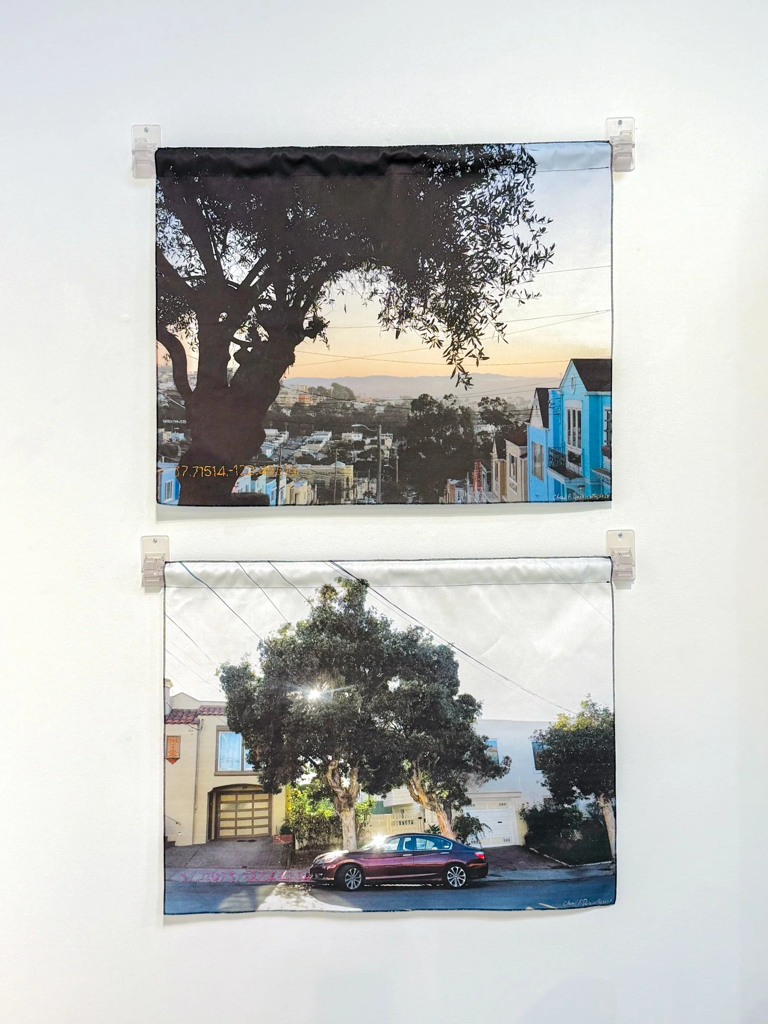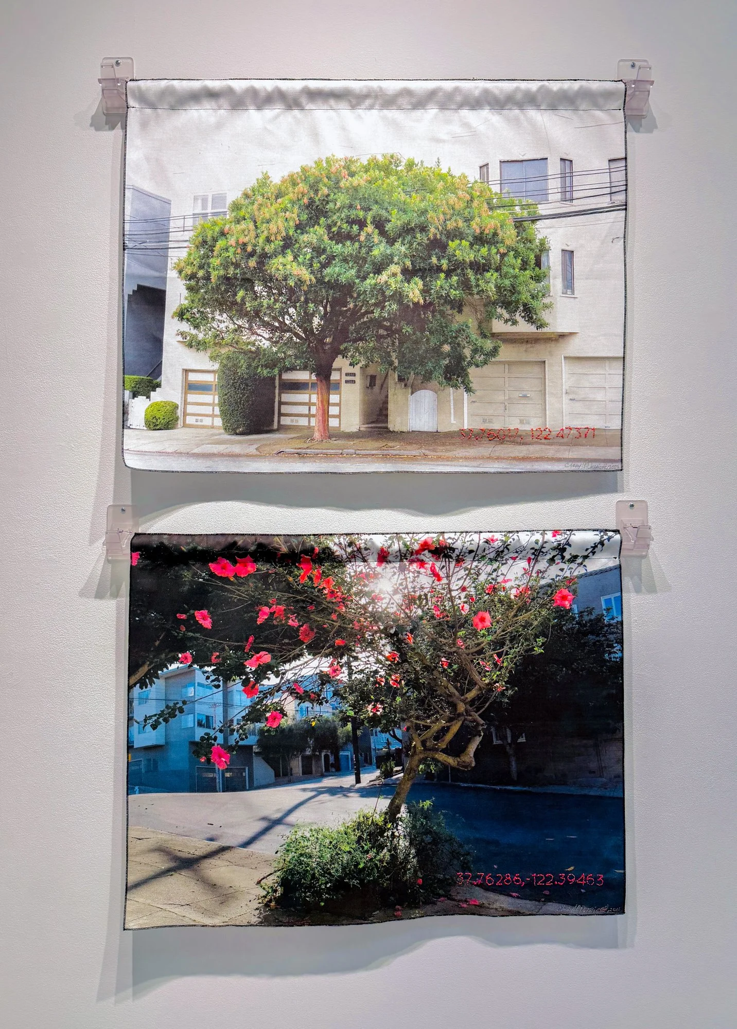 Thirteen of the photographic textile works, annotated with latitude and longitude coordinates, position trees as points of orientation across the city. The coordinates anchor each image in the specificity of place while opening onto broader narratives of coexistence. The trees are relational organisms, bound to their neighbors through root systems and shared soil, exchanging nutrients, signaling stress, sustaining one another across difference.